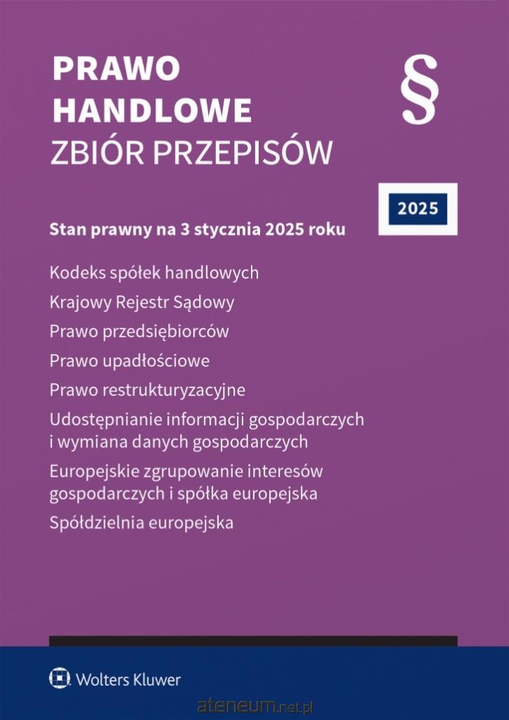 Zbiór obejmuje zmiany, które zostały opublikowane do dnia 3 stycznia 2025 r., w tym np: KRAJOWY REJESTR SĄDOWY: 1 stycznia 2025 r. - ustawa z 18 listopada 2020 r. o doręczeniach elektronicznych (Dz.U. z 2023 r. poz. 285 ze zm.) 1 kwietnia 2025 r. - ustawa z 6 grudnia 2024 r. o zmianie ustawy o rachunkowości, ustawy o biegłych rewidentach, firmach audytorskich oraz nadzorze publicznym oraz niektórych innych ustaw (Dz.U. poz. 1863) 22 czerwca 2025 r. - ustawa z 12 kwietnia 2024 r. o zmianie ustawy o rachunkowości oraz niektórych innych ustaw (Dz.U. poz. 619 ze zm.) PRAWO PRZEDSIĘBIORCÓW: 10 listopada 2024 r. - ustawa z 12 lipca 2024 r. - Przepisy wprowadzające ustawę - Prawo komunikacji elektronicznej (Dz.U. poz. 1222) 19 marca 2025 r. - ustawa z 6 grudnia 2024 r. o zmianie ustawy - Kodeks pracy oraz niektórych innych ustaw (Dz.U. poz. 1871) 1 kwietnia 2025 r. - ustawa z 29 października 2021 r. o zmianie ustawy o podatku dochodowym od osób fizycznych, ustawy o podatku dochodowym od osób prawnych oraz niektórych innych ustaw (Dz.U. poz. 2105 ze zm.) PRAWO UPADŁOŚCIOWE: 10 listopada 2024 r. - ustawa z 12 lipca 2024 r. - Przepisy wprowadzające ustawę - Prawo komunikacji elektronicznej (Dz.U. poz. 1222) PRAWO RESTRUKTURYZACYJNE: 27 września 2024 r. - obwieszczenie Marszałka Sejmu Rzeczypospolitej Polskiej z 11 września 2024 r. w sprawie ogłoszenia jednolitego tekstu ustawy - Prawo restrukturyzacyjne (Dz.U. poz. 1428) 10 listopada 2024 r. - ustawa z 12 lipca 2024 r. - Przepisy wprowadzające ustawę - Prawo komunikacji elektronicznej (Dz.U. poz. 1222) UDOSTĘPNIANIE INFORMACJI GOSPODARCZYCH I WYMIANA DANYCH GOSPODARCZYCH: 30 listopada 2024 r., 1 maja 2025 r. - ustawa z 18 października 2024 r. o zmianie ustawy o udostępnianiu informacji gospodarczych i wymianie danych gospodarczych (Dz.U. poz. 1597)