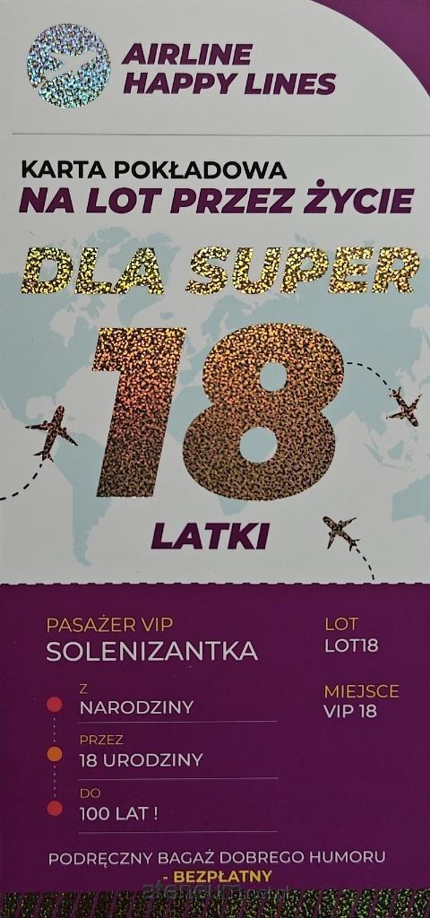 Karnet SE. Karnet na 18 Urodziny w formie karty pokładowej na lot przez życie. Uszlachetniony wysokiej jakości złoceniem holograficznym. Karnet zawiera zabawne życzenia.