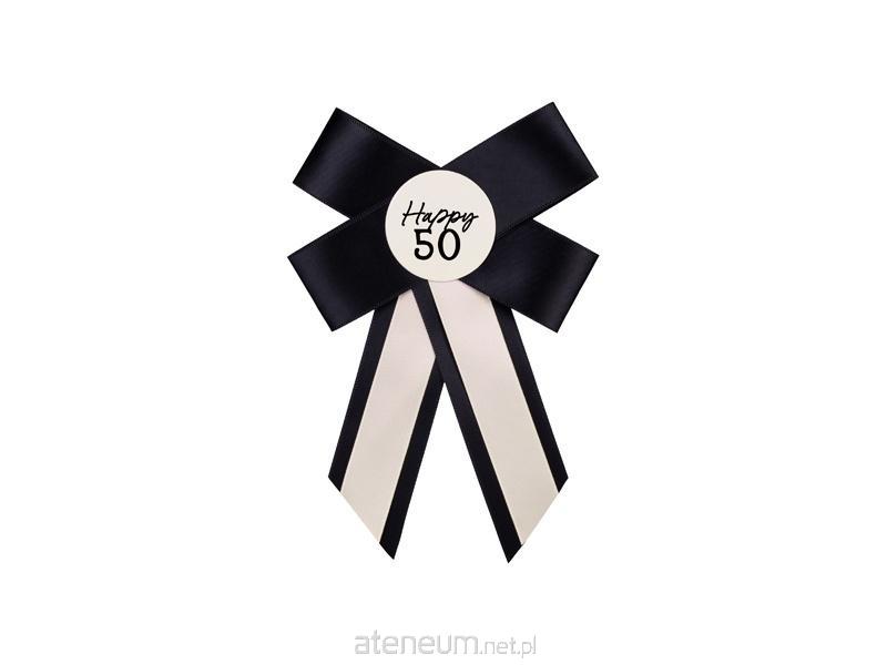 Kotylion na 50 urodziny w kolorze kremowo-czarnym, wymiary ok. 11 x 17 cm. Kotylion wyposażony jest w agrafkę.