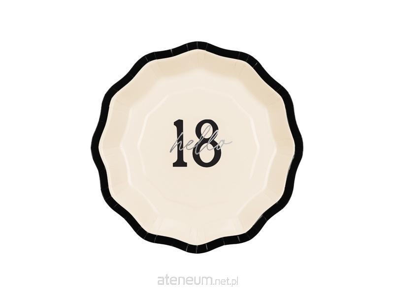 Talerzyki papierowe ''Hello 18''. Kremowe talerzyki na 18 urodziny z czarnymi elementami i srebrnym, błyszczącym napisem Hello. Mix kolorów, średnica około 18 cm.(1 op. / 6 szt.)