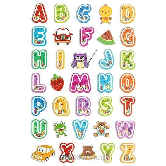 Naklejki z pianki z kolorowymi literkami: alfabetem uzupełnione kilkoma wizerunkami zwierzątek .