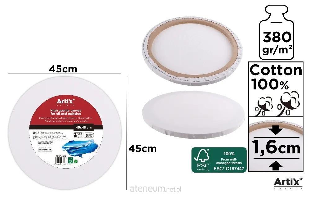 Wysokiej jakości okrągłe płótno o gramaturze 380 g/m2 wykonane w 100% z bawełny, doskonale naciągnięte i zszyte do drewnianej ramy o grubości1,6 cm. Nadaje się do malowania olejnego i akrylowego.