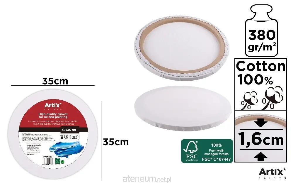 Wysokiej jakości okrągłe płótno o gramaturze 380 g/m2 wykonane w 100% z bawełny, doskonale naciągnięte i zszyte do drewnianej ramy o grubości1,6 cm. Nadaje się do malowania olejnego i akrylowego.