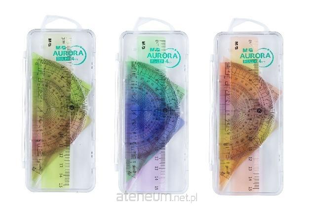 Zestaw zawiera linijkę 15 cm, 2 ekierki oraz kątomierz