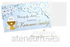 Koperta podarunkowa na I Komunię Świętą KOP-008. Koperta podarunkowa jest eleganckim sposobem na podarowanie bliskiej osobie banknotu lub karty podarunkowej. Koperta jest kolorowa i uszlachetniona metalizowaną folią hot-stamp, jest solidnie wykonana i wyposażona w rzep, co umożliwia jej wielokrotne otwieranie i zamykanie. Koperta zawiera życzenia w środku. Specyfikacja: wymiary: 20 x 10,5 cm (po złożeniu) wnętrze: życzenia w środku okazja: Komunia