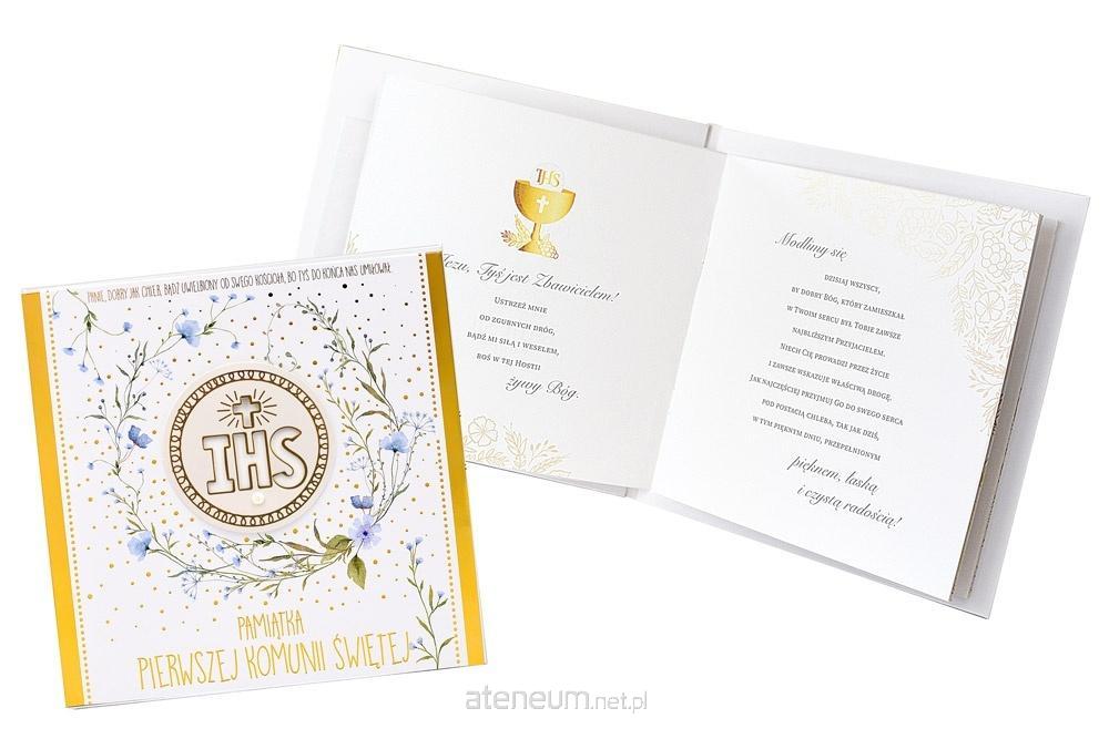 Pamiątka Pierwszej Komunii Świętej - Książeczka Passion Moments Books Q PMB Q-0009 Książeczki PMB Q to produkt wyjątkowy - pięknie wydany, elegancki, zdobiony złotą oraz perłową folią, z kolorowym wnętrzem z pięknymi grafikami i cytatami oraz życzeniami i miejscem na osobistą dedykację. Na wewnętrznej stronie okładki wklejona jest specjalna, nieduża koperta, w której można przekazać kartę podarunkową lub banknot. Książeczka PMB Q Kukartka to idealny prezent na wyjątkową okazję, jaką niewątpliwie jest Pierwsza Komunia Święta. Cechy szczególne: Format: 20 x 20 cm zdobienie: złota oraz perłowa folia wnętrze: kolorowe, z grafikami, cytaty, miejsce na dedykację i wpisanie miejsca/godziny uroczystości, gratis: koperta na drobny upominek wewnątrz, okazja: komunia, Pierwsza Komunia Święta.