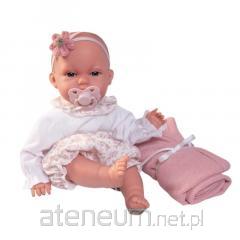 Lalka hiszpańska płacząca Beni z torebką 42 cm Antonio Juan 16384 Jeśli mała wielbicielka wyjątkowych zabawek marzy o hiszpańskiej lali przyjaciółce, idealnej do przytulania, przebierania i czesania, blondynka o imieniu Beni z pewnością wzbudzi zachwyt. Model 16384 z miękkim brzuszkiem, od renomowanego producenta Antonio Juan ma 42 cm wysokości i przypomina małą dziewczynkę. Po wyjęciu smoczka płacze i mówi: mama, papa. Stale otwarte, brązowe oczy o głębokim spojrzeniu opatrzone są długimi rzęsami i delikatnie namalowanymi brwiami. Lalka hiszpańska Antonio Juan Beni 16384 w modnym stroju Wykonana z wysokiej jakości, przyjemnego w dotyku winylu lalka hiszpańska Antonio Juan 16384 posiada materiałowy brzuszek wypełniony miękką wyściółką. Beni ubrana jest w oryginalny, szyty ręcznie strój, który można zdjąć: jasny ciepła bluza z kapturem i tiulową kokardą ładnie prezentuje się w komplecie z bawełnianymi długimi spodenkami w roślinny wzór, zestaw uzupełnia specjalny smoczek magnetyczny na tasiemce oraz mała żółta torebka dla lalki. Atonio Juan Beni to unikalna lalka hiszpańska na prezent Lalka Beni 42 cm posiada wszystkie wymagane certyfikaty bezpieczeństwa. Jest przeznaczona dla dzieci od 3 roku życia. Wyprodukowana została w całości w Hiszpanii. Zapakowana w biało-różowe, ozdobne pudełko z wieczkiem, świetnie sprawdzi się jako oryginalny prezent dla wielbicielki wyjątkowych zabawek.