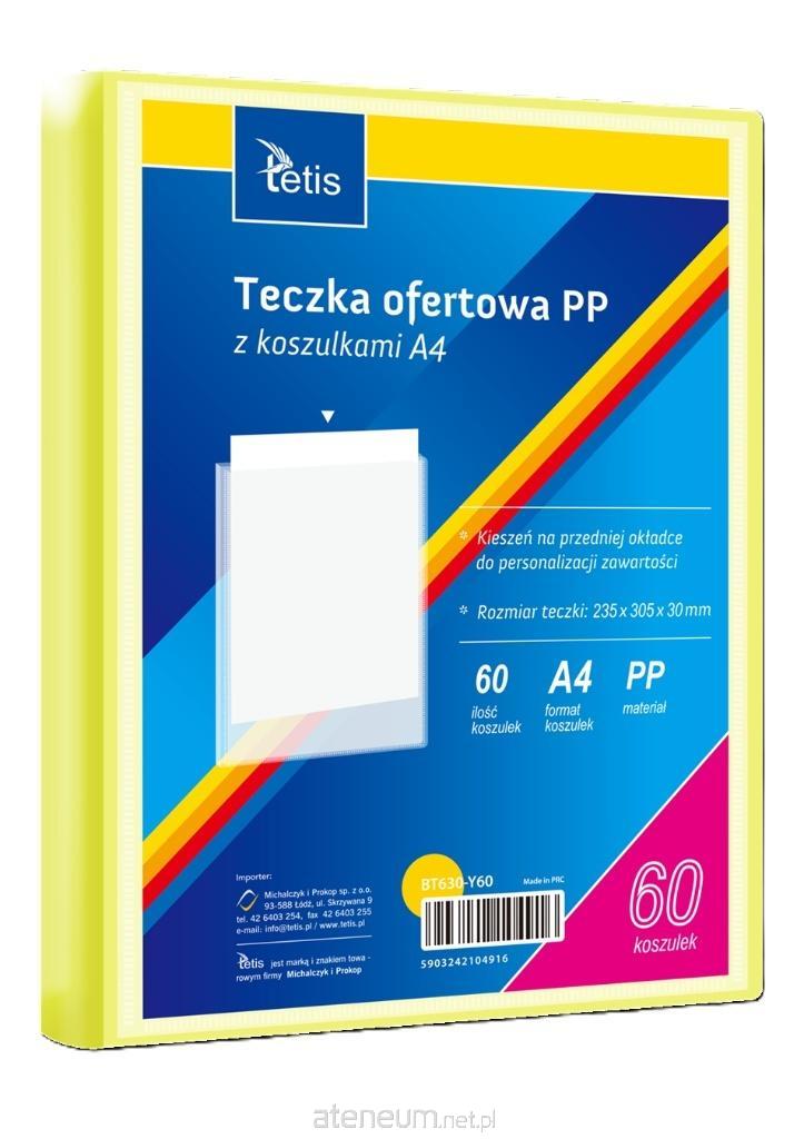 Teczka ofertowa PP z koszulkami. Posiada grzbiet i kieszeń opisową na przedniej okładce, format A4 Teczka posiada 13 przegród. Wymiary teczki: 330x245x35 mm, grubość tworzywa PP: 0,50 mm. Dostępna w pięciu kolorach (niebieski, czerwony, pomarańczowy, żółty, czarny). Opakowanie: folia 1 szt.
