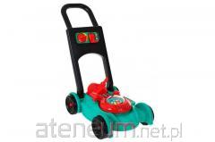 Kosiarka jest w kolorze ciemno zielonym z czarną rączką i kolami. Koła są ruchome, więc kosiarka może poruszać się po różnych powierzchniach. Wnętrze kosiarki jest puste, dzięki czemu ma ona odpowiednią, niską wagę dla zabawy dzieci. Popularna zabawka ogrodnicza jest wyposażona w imitację elektrycznego rozrusznika umieszczonego na rączce kosiarki, a także w czerwony element przekładni na obudowie kosiarki, imitujący regulację wysokości koszenia. Kosiarka podczas toczenia się wydaje realistyczne odgłosy terkotania, a koła przy poruszaniu dodatkowo wesoło dudnią. Czarny uchwyt w postaci rączki do prowadzenia kosiarki ma około 45 cm długości, co daje odpowiednio około 50 cm wysokości i 25 cm szerokości gotowego do zabawy sprzętu ogrodniczego. Kosiarka z pewnością spodoba się wszystkim dzieciom uwielbiającym zabawy w ogrodnika. Dzięki wysokiej jakości wykonania, zestaw będzie służyć przez długi czas.