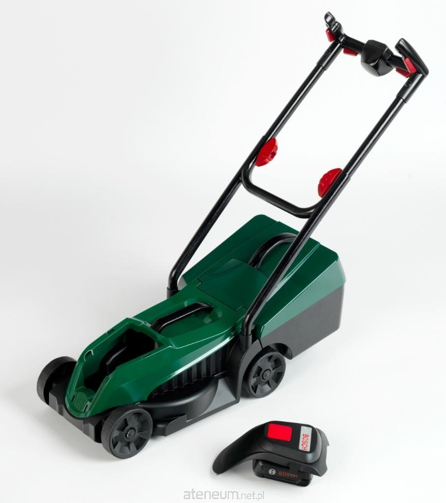 Kosiarka jest w kolorze ciemno zielonym z czarną rączką do prowadzenia i kolami. Koła są ruchome, więc kosiarka może poruszać się po różnych powierzchniach. Elementem wyróżniającym ten sprzęt jest wyciągany moduł świetlno-dźwiękowy umieszczony na czole zabawki, gdzie po naciśnięciu przycisku w module podświetla się logo Bosch, a także zaczyna on wydawać bardzo realistyczne odgłosy pracy silnika i koszenia trawy. Moduł zasilany jest bateryjnie i jest kompatybilny z innymi zabawkami serii Bosch (KL8567 Wiertarko-wkrętarka i KL 8448 Lampa przegubowa). Zabawka wymaga użycia baterii, które nie są zawarte w zestawie. Wnętrze kosiarki jest puste, dzięki czemu ma ona odpowiednią, niską wagę dla zabawy dzieci, a do jej ewentualnego przenoszenia na górze obudowy umieszczono specjalny uchwyt. Kolejnym istotnym elementem tej kosiarki jest zdejmowany kosz na odpady. Popularna zabawka ogrodnicza jest wyposażona w imitację elektrycznego rozrusznika umieszczonego na rączce kosiarki. Pomimo dostępnego modułu świetlno-dźwiękowego, kosiarka podczas toczenia się wydaje mechaniczne odgłosy terkotania, a koła przy poruszaniu dodatkowo wesoło dudnią. Czarny uchwyt w postaci rączki do prowadzenia kosiarki ma około 45 cm długości, co daje odpowiednio około 55 cm wysokości i 22 cm szerokości gotowego do zabawy sprzętu ogrodniczego. Kosiarka z pewnością spodoba się wszystkim dzieciom uwielbiającym zabawy w ogrodnika. Dzięki wysokiej jakości wykonania, zestaw będzie służyć przez długi czas.