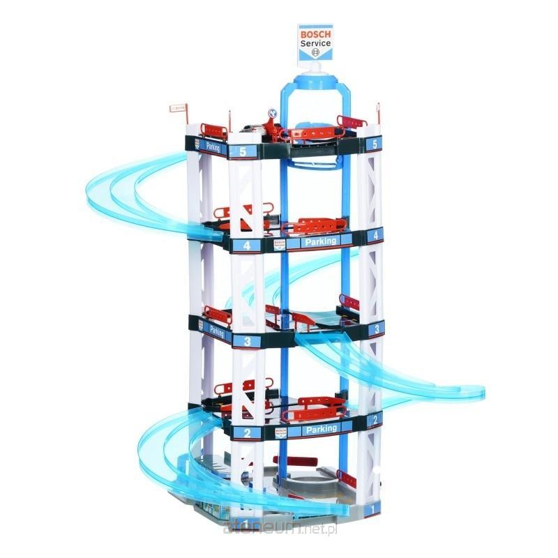 5-poziomowy garaż samochodowy z serii zabawek Bosch Service, został zaprojektowany tak, aby mógł służyć dzieciom jako uniwersalny 5 piętrowy parking. Poszczególne poziomy połączone są półprzezroczystym, elastycznym, błękitnym, torem biegnącym od najwyższego piętra na sam dół. Tor stworzono tak, aby mogły po nim zjeżdżać zarówno małe samochodziki, jak i te trochę większe. Mianowicie, po jednej stronie tor podzielony jest na pół barierką tworzącą 2 równoległe tory wyścigowe, a po drugiej - mamy jeden szeroki tor. Zmiana rodzaju toru następuje poprzez wypięcie go i odwrócenie "do góry nogami". Jest to bardzo prosta czynność. Parking ten wyposażony jest w windę, którą można przemieszczać dwa samochodziki jednocześnie między piętrami. Windę obsługuje się ręcznie, przesuwając platformę dla autek w górę lub w dół. Na najwyższym piętrze znajduje się pole startowe wyścigu dla dwóch samochodzików oraz parking, na trzech poziomach środkowych również jest parking, natomiast na najniższym piętrze znajduje się meta wyścigu, kolejne miejsca parkingowe oraz stacja benzynowa i imitacja budynku serwisu samochodowego. W zestawie znajdują się 2 metalowe samochodziki, które aż proszą się o wzięcie udziału w wyścigu. Ten 5-poziomowy Garaż Bosch Service firmy Klein jest doskonałym elementem zabawy każdego małego wielbiciela motoryzacji.
