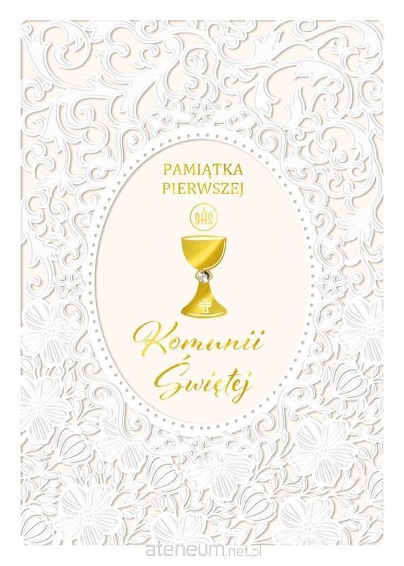 Elegancki karnet na Pierwszą Komunię Świętą w formacie B6 z laserowo wycinanym wzorem. Delikatny, ażurowy motyw z symbolami religijnymi, takimi jak hostia, krzyż czy gołąb. Wewnątrz miejsce na życzenia i dane uroczystości. Idealna pamiątka tego ważnego dnia.