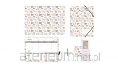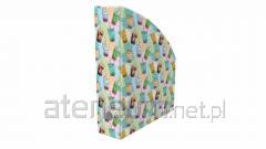 Wykonany z folii PVC z pełnym, ozdobnym nadrukiem, wewnątrz usztywniony tekturą. Okrągłe wycięcie na palec pozwalające na łatwe wysuwanie pojemnika. Szerokość grzbietu 7 cm. Format A4 o ściętych, zaokrąglonych bokach.