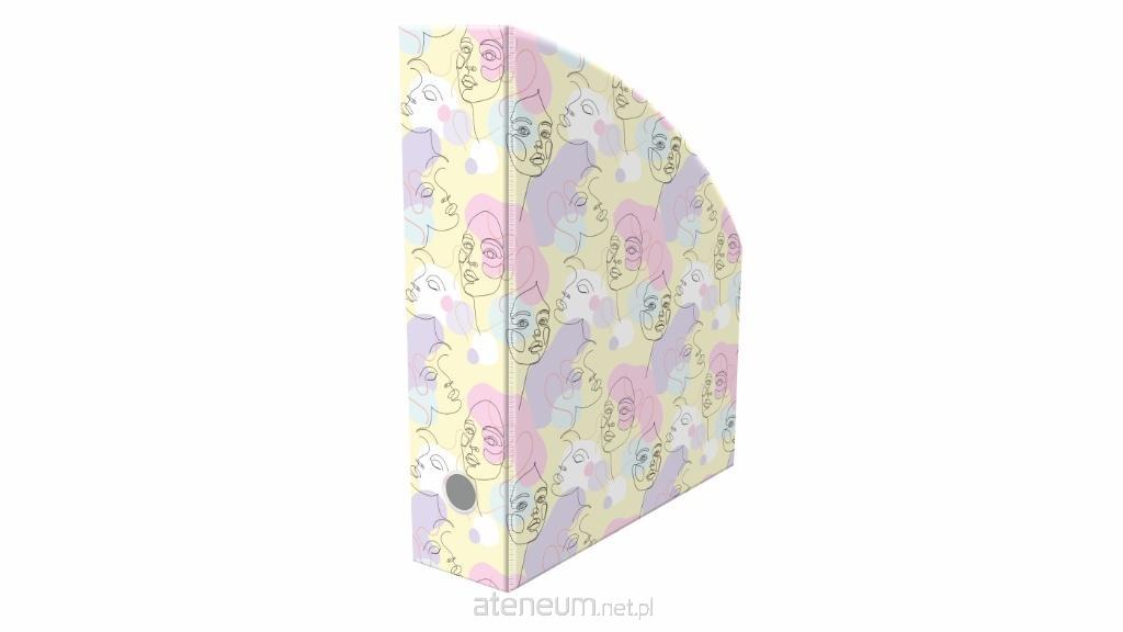 Wykonany z folii PVC z pełnym, ozdobnym nadrukiem, wewnątrz usztywniony tekturą. Okrągłe wycięcie na palec pozwalające na łatwe wysuwanie pojemnika. Szerokość grzbietu 7 cm. Format A4 o ściętych, zaokrąglonych bokach.