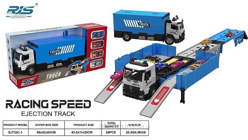 auto ciężarowe z rozkładaną naczepą, tworzącą parking, 4 autka, światło, dźwięk, bat.3xAG13 dołóćzone; 44x11x20cm, W/B