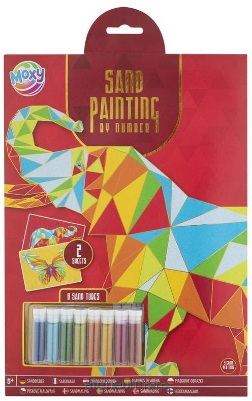Malowanie piaskiem po numerach, na formacie A4. Wariant: Słoń. W zestawie 8 fiolek kolorowego piasku niezbędnego do wypełnienia kolorem pokrytych klejem obrazków. Super kreatywna zabawa dla dzieci powyżej 5 lat.