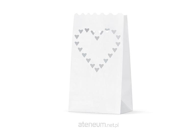 Lampiony na świece w kształcie torebek w kolorze białym, z motywem serca, wymiary 15x9x26 centymetrów. Wykonane z niepalnego papieru.(1 op. / 10 szt.)