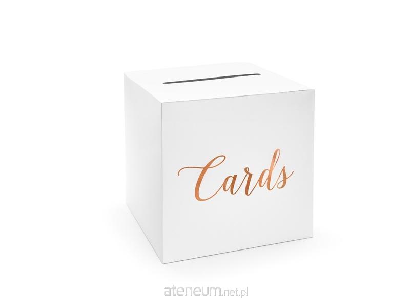 Pudełko na koperty wykonane z białego papieru z metalizowanym napisem Cards w kolorze różowego złota, wymiary po złożeniu ok 24 x 24 x 24 cm.