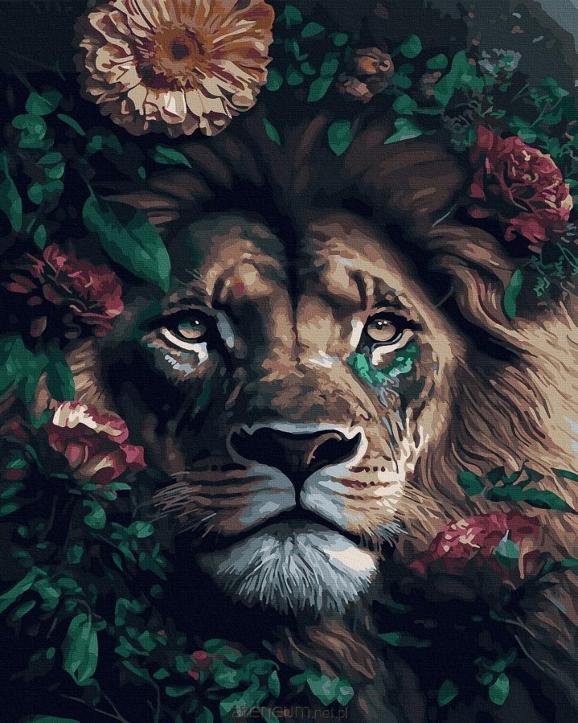 Dumny lew otoczony bujną roślinnością i kwiatami. Symbol siły, odwagi i naturalnego piękna obraz z mocnym charakterem.