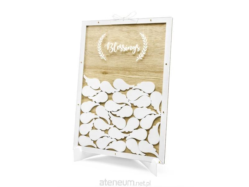 Drewniana księga gości z białym napisem Blessings, zestaw zawiera prostokątną księgę w oraz 30 białych skrzydełek do wypisania, wymiary ok. 27,5 x 39,5 cm.