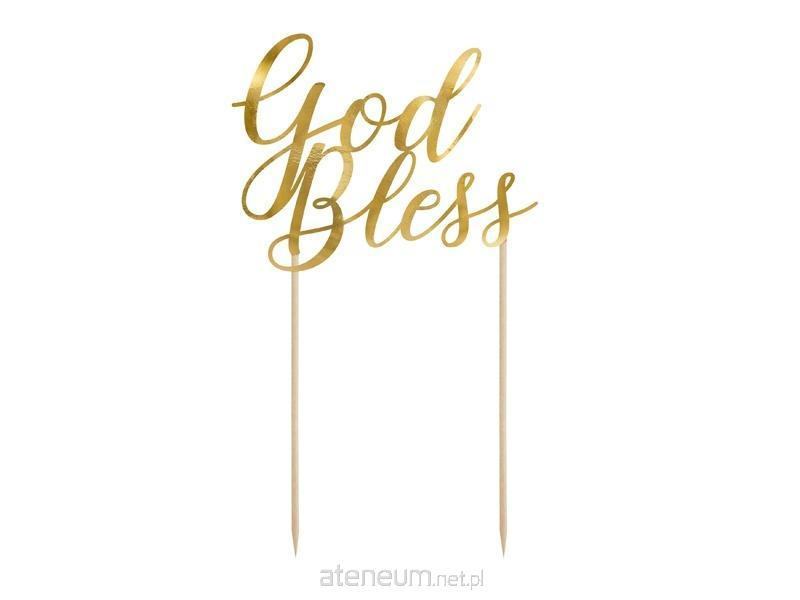 Toppery na tort God Bless wykonane z papieru w kolorze złotym lustrzanym, produkt do samodzielnego złożenia, wysokość po złożeniu ok. 27,5 cm.