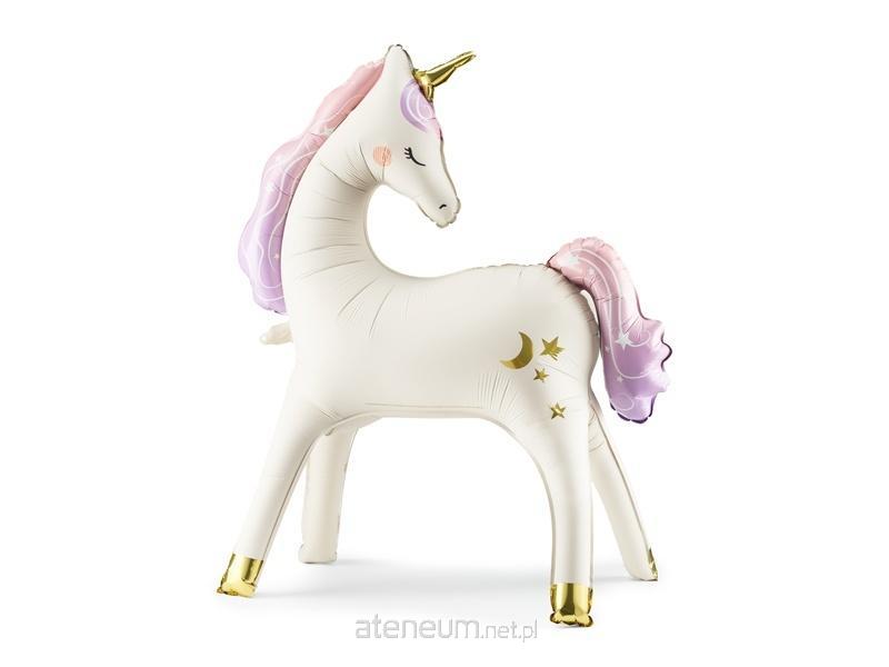 Stojący balon foliowy matowy Jednorożec w kolorze beżowym ze złotymi i tęczowymi elementami. Wymiary przed napompowaniem 104 x 117 cm (41 x 46''), wymiary po napompowaniu 95 x 86 cm (37.5 x 34''). Do napompowania powietrzem. Zestaw zawiera słomkę. Balon jest samouszczelniający się.