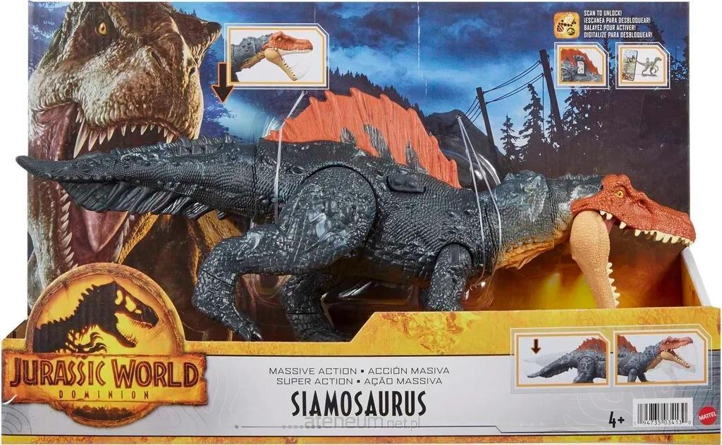 Jurassic World Dinozaur Siamosaurus Massive Action HDX51 to realistyczna figurka dinozaura inspirowana filmem Jurassic World Dominion. Produkt pochodzi z serii Massive Action od firmy Mattel, zaprojektowanej z myślą o dynamicznej i interaktywnej zabawie. Model wykonany z wytrzymałego tworzywa sztucznego (ABS, PVC) charakteryzuje się wysoką jakością wykonania oraz dużym poziomem szczegółowości. Figurka ma długość ok. 35 cm i wysokość ok. 15 cm. Wyróżnia się realistyczną teksturą skóry, szczegółowym odwzorowaniem detali anatomicznych i dynamiczną kolorystyką z dominującymi barwami ciemnego grafitu i czerwono-brązowej głowy. Na grzbiecie znajduje się pomarańczowy grzebień imitujący strukturę kostną.