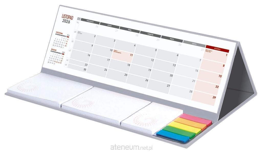 Wygodny kalendarz stojący na biurko z przejrzystym kalendarium w układzie trójdzielnym z poręcznymi karteczkami samoprzylepnymi do notowania. Przydatny zwłaszcza w biurze. W kalendarzu zaznaczono święta i daty imienin. Na tylnej części kalendarza istnieje możliwość wykonania nadruku reklamowego na obszarze o wymiarach 305 x 100 mm.