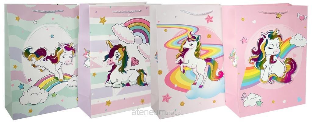 Torebka ozdobna PL-2 mała Naklejana Jednorożce, mix wzorów, wzór wysyłany losowo. Wymiary torebki po złożeniu 230x180x105mm.