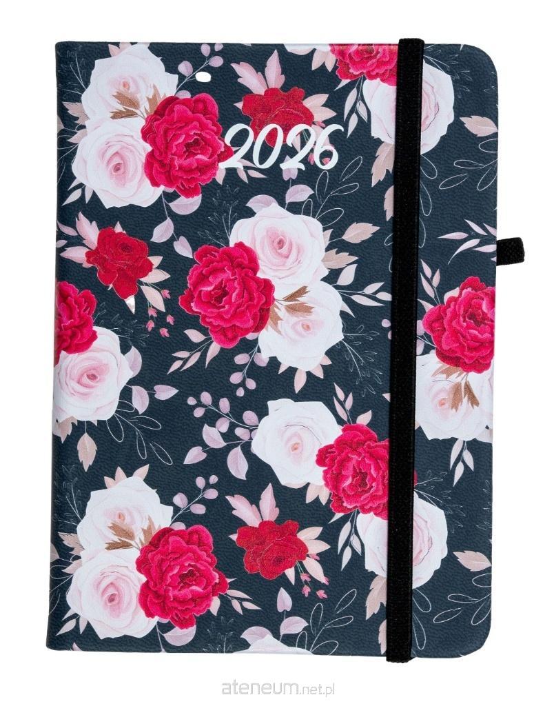 wewnątrz: plan roku i rozkład roku 2026, terminy ferii zimowych, święta oficjalne i zwyczajowe, podróże, protokół powypadkowy w przypadku stłuczki, notes, skorowidz teleadresowy, kalendarium dodatkowe na 2025-2026-2027 rok