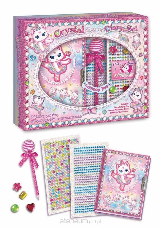 Zestaw zawiera: - mini pamiętnik z kolorowymi kartkami zamykany na zamek - długopis w kształcie lizaka - 4 duże kryształki w różnych kształtach i kolorach - mini zestaw naklejek - 2 arkusze malutkich kolorowych kryształków do wyklejania Wiek: 6+