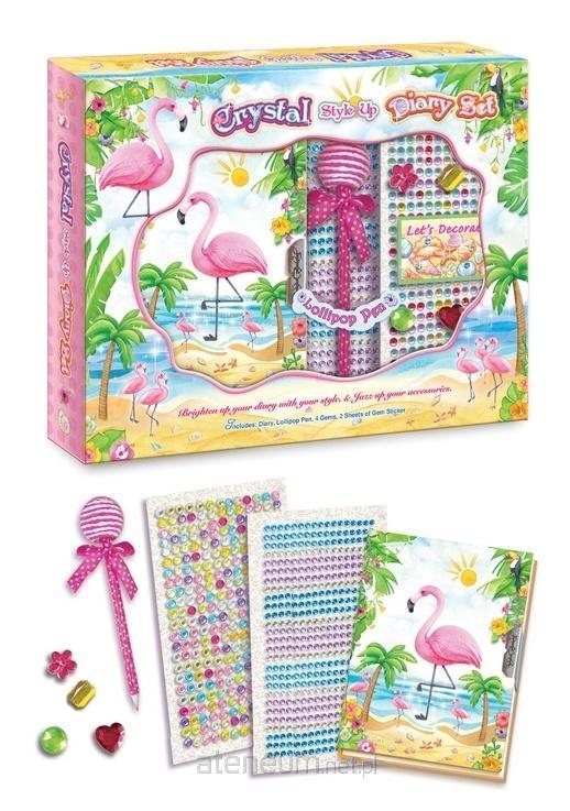 Zestaw zawiera: - mini pamiętnik z kolorowymi kartkami zamykany na zamek - długopis w kształcie lizaka - 4 duże kryształki w różnych kształtach i kolorach - mini zestaw naklejek - 2 arkusze malutkich kolorowych kryształków do wyklejania Wiek: 6+