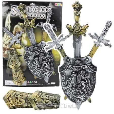 ZESTAW RYCERSKI Z TARCZĄ, 3 MIECZAMI I OCHRANIACZAMI Zestaw rycerski to kompletna i efektowna propozycja dla dzieci, które fascynują się światem średniowiecznych wojowników, walk na miecze oraz odważnych bohaterów z legend i bajek. To aż pięć elementów w jednej zabawce - idealnej do odgrywania ról, kreatywnych przygód i codziennej zabawy. W skład zestawu wchodzą: trzy różne miecze rycerskie, w tym jeden większy - główny oręż wojownika - oraz ozdobna tarcza z heraldycznym motywem, a także dwa ochraniacze na ręce, które imitują elementy zbroi. Wszystkie części wykonane są z lekkiego, ale trwałego tworzywa sztucznego, które jest bezpieczne i odporne na intensywną zabawę. Bogate zdobienia, klasyczna kolorystyka i realistyczna forma sprawiają, że zestaw robi wrażenie nie tylko w trakcie zabawy, ale również jako dekoracja dziecięcego pokoju. To doskonała propozycja na prezent dla każdego małego fana rycerskich opowieści. SPECYFIKACJA: Motyw: Rycerski / Średniowieczny Materiał: tworzywo sztuczne Wymiary opakowania: 58 x 39 x 5 cm Wymiary małych mieczy: 49 cm Wymiary dużego miecza: 59 cm ZAWARTOŚĆ ZESTAWU: 3 miecze rycerskie (w tym 1 duży) 1 tarcza z ozdobnym motywem 2 ochraniacze na ręce Opakowanie z grafiką rycerską