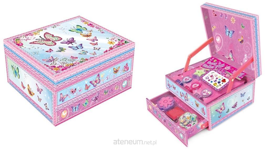 Zestaw zawiera: - 3 pieczątki w różnych kształtach - pojemnik z tuszem - kryształki do wyklejania - naklejki do ozdabiania Zapakowany w ozdobne pudełeczko-szkatułkę z samootwierającą się szufladką. Wystarczy podnieść wieczko, a szufladka sama się wysunie.