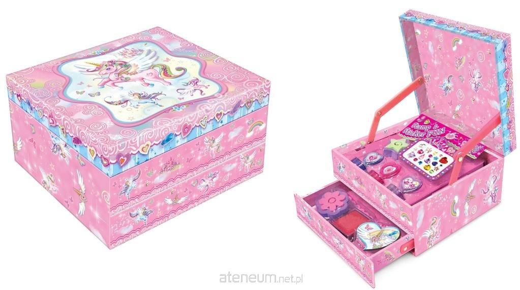 Zestaw zawiera: - 3 pieczątki w różnych kształtach - pojemnik z tuszem - kryształki do wyklejania - naklejki do ozdabiania Zapakowany w ozdobne pudełeczko-szkatułkę z samootwierającą się szufladką. Wystarczy podnieść wieczko, a szufladka sama się wysunie.