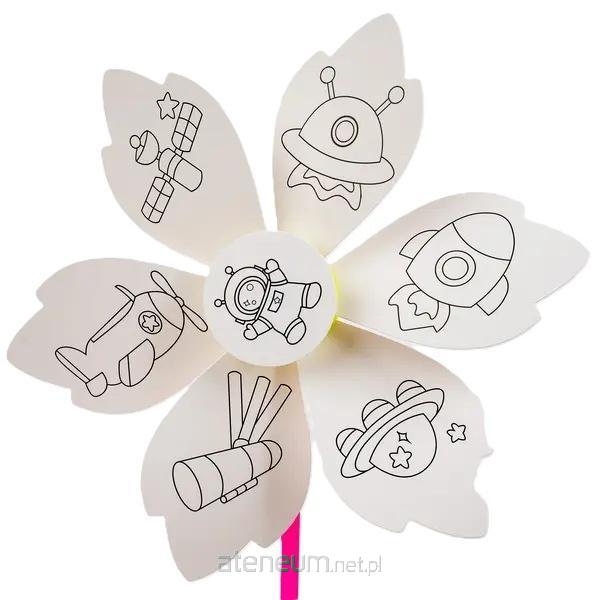 papierowy wiatraczek z szablonem do malowania, 6 końcówek, centralne koło, patyczek, całkowita długość złożonego wiatraczka 38,5 cm