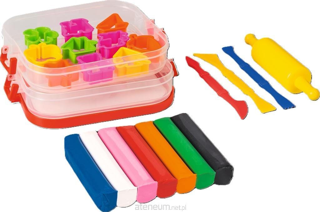 Zamykane pudełko zawierające: 7 kolorów brylantowej plasteliny, wałek, 10 foremek i 3 różne narzędzia