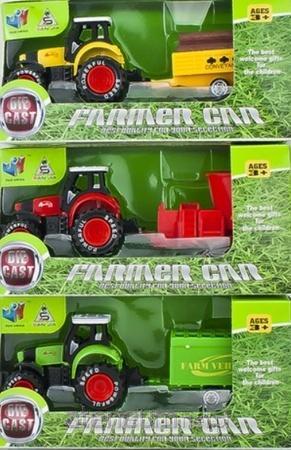 Metalowy traktor z przyczepą, wykonany z wysokiej jakości materiałów. Zabawka kompaktowych rozmiarów (dł. zestawu ok 15cm), idealna na prezent w podróży.