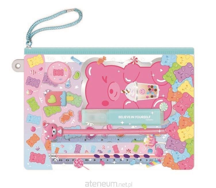 Zestaw zawiera: - notatnik z czystymi karteczkami - zakreślacz - długopis żelowy z ozdobną nakładką - ołówek - linijka - gumka do mazania - temperówka - arkusz naklejek Zestaw zapakowany w ozdobną saszetkę zamykaną na zamek z uchwytem do wygodnego przenoszenia. Wiek: 5+