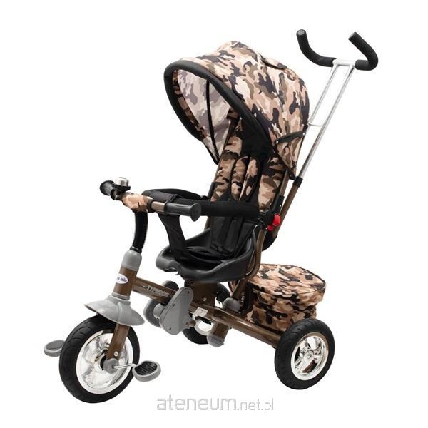 CHARAKTERYSTYKA PRODUKTU: - Obrotowe siedzisko o 360 stopni - jazda przodem lub tyłem - Sterowanie rączką, regulowana wysokość rączki do pchania do 100cm - Funkcja wolnego koła (przekładnia zapadkowa) - Regulowane 3-poziomowe oparcie siedziska, dziecko może jechać w pozycji półleżącej lub leżącej, ustawione przodem do rodzica - Trzypunktowe pasy bezpieczeństwa - Regulacja odległości siedziska od kierownicy - Duża rozkładana materiałowa budka chroni przed niekorzystnymi warunkami atmosferycznymi - Okienko w budce - Nieprzebijalne koła gumowe - Blokady tylnych kół - Wytrzymała stalowa rama, odporna na uszkodzenia i bardzo stabilna - Przednie koło pełne - zabezpiecza przed wkręceniem się nóżki - Składany podnóżek pod siedziskiem - Koszyczek na różne drobiazgi (zabawki) dla dziecka - Łatwo demontowalna i regulowana teleskopowa rączka do pchania - Łatwa do czyszczenia, demontowalna poręcz zabezpieczająca - Gumowe antypoślizgowe rękojeści z osłonkami - Przednie koło wyposażone w błotnik - Kompaktowe składanie, umożliwiające wygodne przewożenie rowerka - System szybkiego, intuicyjnego składania- Przedział wiekowy 1,5-5 lat - Dostępna kolorystyka: niebieski, bordo, army, szary, różowy - Spełnia europejskie normy bezpieczeństwa WYMIARY PRODUKTU: - Wysokość 108 cm - Długość rowerka 92cm - Regulacja wysokości rączki: 83-108 cm - Szerokość kierownicy: 43 cm - Szerokość rowerka: 55 cm - Średnica kół: przód - 10", tył - 8" - Maksymalne obciążenie do 25 kg - Waga: 12,4 kg OPAKOWANIE: 61x41x28 cm Waga z opakowaniem: 13,5 kg