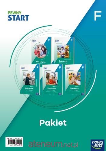 Pewny start. Poziom F. Moja książka, Codziennik. Funkcjonowanie 1-2, Komunikacja, Kreatywność. Zestaw to kompleksowy zestaw kart pracy, obejmujący 720 ilustrowanych kart, podzielonych na pięć uzupełniających się publikacji dostosowanych do potrzeb uczniów. Materiały odnoszą się do kalendarza szkolnego oraz codziennych sytuacji, wspierając rozwój wszechstronnych kompetencji od matematycznych, przez językowe, psychospołeczne, aż po kreatywne.