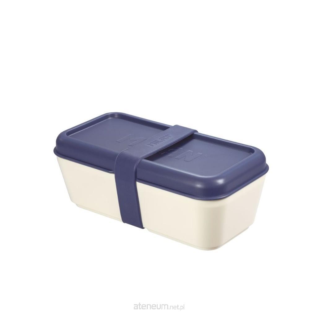 Prostokątny biały pojemnik na lunch z niebieską pokrywką. Posiada wewnętrzną przegrodę, która umożliwia rozdzielenie dwóch rodzajów żywności w tym samym pojemniku oraz granatowy zewnętrzny elastyczny pasek silikonowy. Nadaje się do odgrzewania w kuchence mikrofalowej (maks. 70oC) z otwartą pokrywą dla uwolnienia pary. Nadaje się także do przechowywania w zamrażarce (do -20oC) i do mycia w zmywarce do naczyń (maks. 70oC). Pokrywy i pojemniki można łatwo łączyć ze sobą. Matowe zewnętrzne wykończenie ułatwia uchwyt. Wnętrze z zaokrąglonymi narożnikami i błyszczącym wykończeniem dla lepszego czyszczenia. Materiał: tworzywo sztuczne wolne od BPA. Rozmiar: 20 x 10 x 7,5 cm. Pojemność: 0,75 litra.