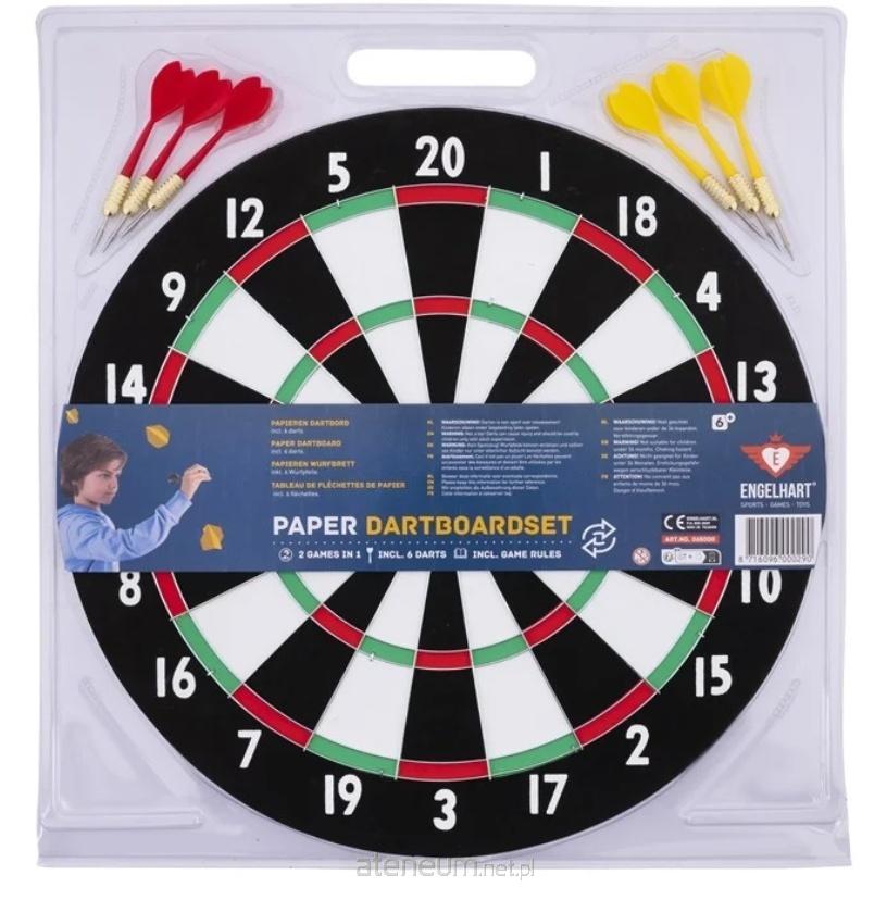 Dwustronna papierowa tarcza do darta z 6 mosiężnymi lotkami o wadze 18 gramów. Grubość tarczy do darta wynosi 1 cm, a średnica 43 cm.