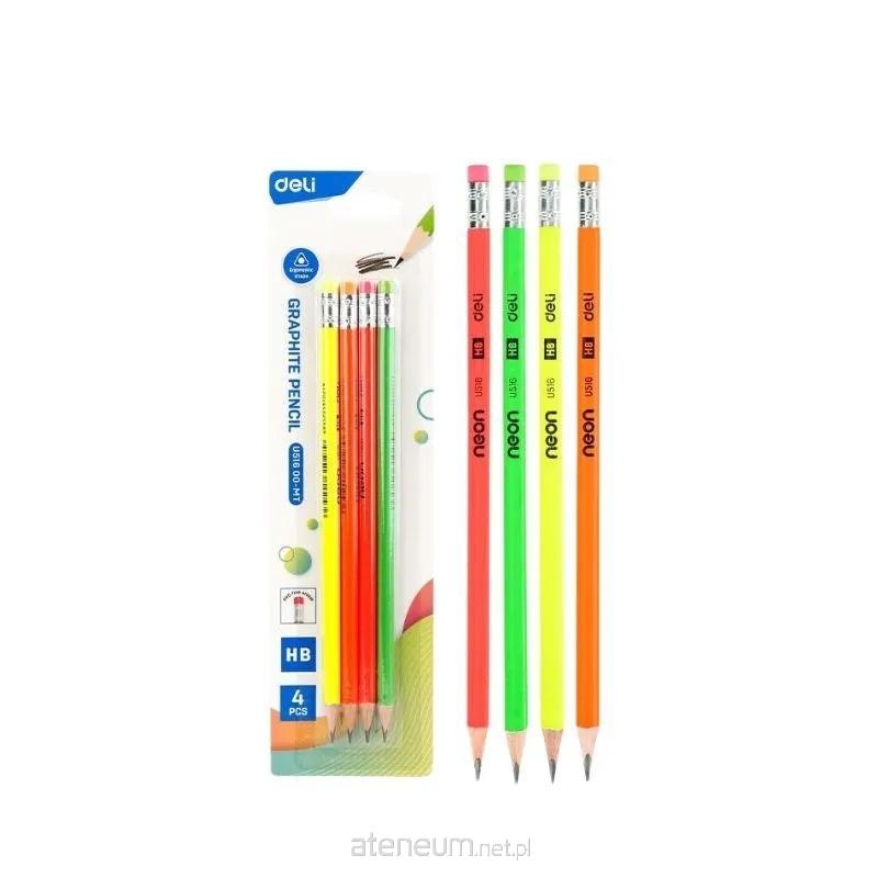 DELI Ołówek Neonowy HB z Gumką, 4 szt.