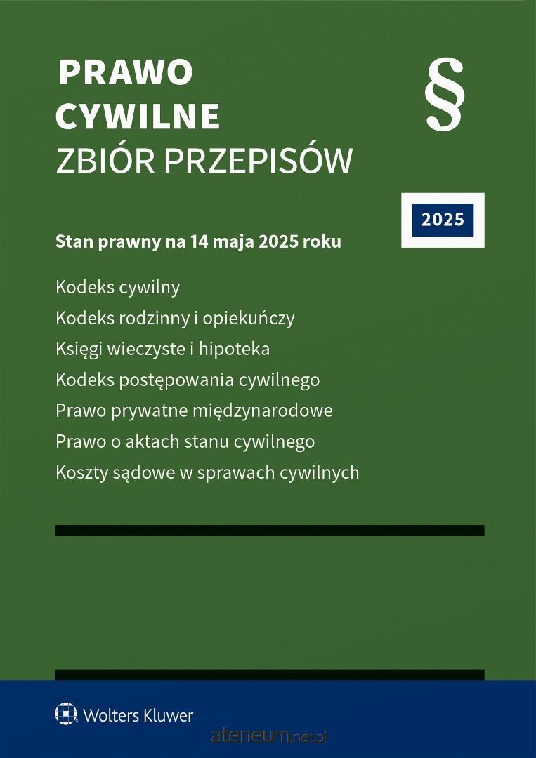 UWZGLĘDNIA ZMIANY WCHODZĄCE W ŻYCIE Z DNIEM: KODEKS CYWILNY: 29 sierpnia 2024 r. - ustawa z 24 lipca 2024 r. o zmianie ustawy o dochodzeniu roszczeń w postępowaniu grupowym oraz niektórych innych ustaw (Dz.U. poz. 1237) KSIĘGI WIECZYSTE I HIPOTEKA: 10 listopada 2024 r. - ustawa z 12 lipca 2024 r. - Przepisy wprowadzające ustawę - Prawo komunikacji elektronicznej (Dz.U. poz. 1222) 18 marca 2025 r. - obwieszczenie Marszałka Sejmu Rzeczypospolitej Polskiej z 6 marca 2025 r. w sprawie ogłoszenia jednolitego tekstu ustawy o księgach wieczystych i hipotece (Dz.U. poz. 341) KODEKS POSTĘPOWANIA CYWILNEGO: 29 sierpnia 2024 r. - ustawa z 24 lipca 2024 r. o zmianie ustawy o dochodzeniu roszczeń w postępowaniu grupowym oraz niektórych innych ustaw (Dz.U. poz. 1237) 1 października 2024 r. - ustawa z 15 maja 2024 r. o wspieraniu rodziców w aktywności zawodowej oraz w wychowaniu dziecka - "Aktywny rodzic" (Dz.U. poz. 858) 23 października 2024 r. - obwieszczenie Marszałka Sejmu Rzeczypospolitej Polskiej z 10 października 2024 r. w sprawie ogłoszenia jednolitego tekstu ustawy - Kodeks postępowania cywilnego (Dz.U. poz. 1568) 1 listopada 2024 r. - ustawa z 9 maja 2024 r. o zmianie ustawy o systemie ubezpieczeń społecznych oraz niektórych innych ustaw (Dz.U. poz. 863) 10 listopada 2024 r. - ustawa z 12 lipca 2024 r. - Przepisy wprowadzające ustawę - Prawo komunikacji elektronicznej (Dz.U. poz. 1222) 1 stycznia 2025 r. - ustawa z 18 listopada 2020 r. o doręczeniach elektronicznych (Dz.U. z 2023 r. poz. 285 ze zm.) 1 czerwca 2025 r. - ustawa z 20 marca 2025 r. o rynku pracy i służbach zatrudnienia (Dz.U. poz. 620) 18 kwietnia 2026 r. - ustawa z 5 sierpnia 2015 r. o zmianie ustawy o ochronie konkurencji i konsumentów oraz niektórych innych ustaw (Dz.U. poz. 1634) PRAWO O AKTACH STANU CYWILNEGO: 15 sierpnia 2024 r. - ustawa z 28 lipca 2023 r. o zmianie ustawy - Kodeks cywilny oraz niektórych innych ustaw (Dz.U. poz. 1615) 6 maja 2025 r. - obwieszczenie Marszałka Sejmu Rzeczypospolitej Polskiej z 24 marca 2025 r. w sprawie ogłoszenia jednolitego tekstu ustawy - Prawo o aktach stanu cywilnego (Dz.U. poz. 594) KOSZTY SĄDOWE W SPRAWACH CYWILNYCH: 29 sierpnia 2024 r. - ustawa z 24 lipca 2024 r. o zmianie ustawy o dochodzeniu roszczeń w postępowaniu grupowym oraz niektórych innych ustaw (Dz.U. poz. 1237) ORAZ: 13 marca 2024 r. - obwieszczenie Ministra Sprawiedliwości z 11 października 2024 r. w sprawie ogłoszenia jednolitego tekstu rozporządzenia Ministra Sprawiedliwości w sprawie maksymalnych stawek taksy notarialnej (Dz.U. poz. 1566) 19 grudnia 2024 r. - rozporządzenie Ministra Sprawiedliwości z 11 grudnia 2024 r. zmieniające rozporządzenie w sprawie określenia stawek wynagrodzenia biegłych, taryf zryczałtowanych oraz sposobu dokumentowania wydatków niezbędnych dla wydania opinii w postępowaniu cywilnym (Dz.U. poz. 1875) 31 grudnia 2024 r. - rozporządzenie Ministra Sprawiedliwości z 23 grudnia 2024 r. zmieniające rozporządzenie w sprawie opłat za czynności radców prawnych (Dz.U. poz. 1947) 31 grudnia 2024 r. - rozporządzenie Ministra Sprawiedliwości z 23 grudnia 2024 r. zmieniające rozporządzenie w sprawie ponoszenia przez Skarb Państwa albo jednostki samorządu terytorialnego kosztów pomocy prawnej udzielonej przez radcę prawnego z urzędu (Dz.U. poz. 1948) 31 grudnia 2024 r. - rozporządzenie Ministra Sprawiedliwości z 23 grudnia 2024 r. zmieniające rozporządzenie w sprawie opłat za czynności adwokackie (Dz.U. poz. 1949) 31 grudnia 2024 r. - rozporządzenie Ministra Sprawiedliwości z 23 grudnia 2024 r. zmieniające rozporządzenie w sprawie ponoszenia przez Skarb Państwa albo jednostki samorządu terytorialnego kosztów nieopłaconej pomocy prawnej udzielonej przez adwokata z urzędu (Dz.U. poz. 1950) 13 marca 2025 r. - obwieszczenie Ministra Sprawiedliwości z 6 marca 2025 r. w sprawie ogłoszenia jednolitego tekstu rozporządzenia Ministra Sprawiedliwości w sprawie wynagrodzenia za czynności tłumacza przysięgłego (Dz.U. poz. 312) 18 m