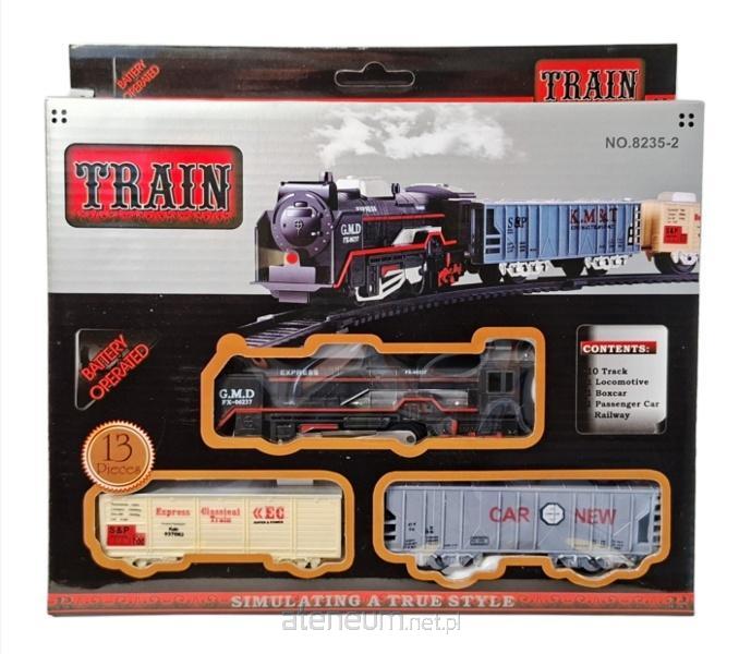 Zestaw pociąg z torami: lokomotywa, wagon osobowy i towarowy. Napęd bateryjny. Całość zawiera 13 elementów. Zapakowany w kartonowe pudełko. Zabawka działa na baterie typu AA. Baterie nie są załączone do zabawki.