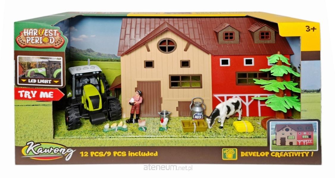Zestaw farma z budynkiem gospodarczym, traktorem, zwierzętami i figurką rolnika. Traktor wydaje dźwięki i świeci kolorowym światełkiem. Zestaw zapakowany w kartonowe pudełko. Zabawka przeznaczona dla dzieci od lat 3. Zabawka działa na baterie typu AG13. Baterie znajdują się w zabawce.
