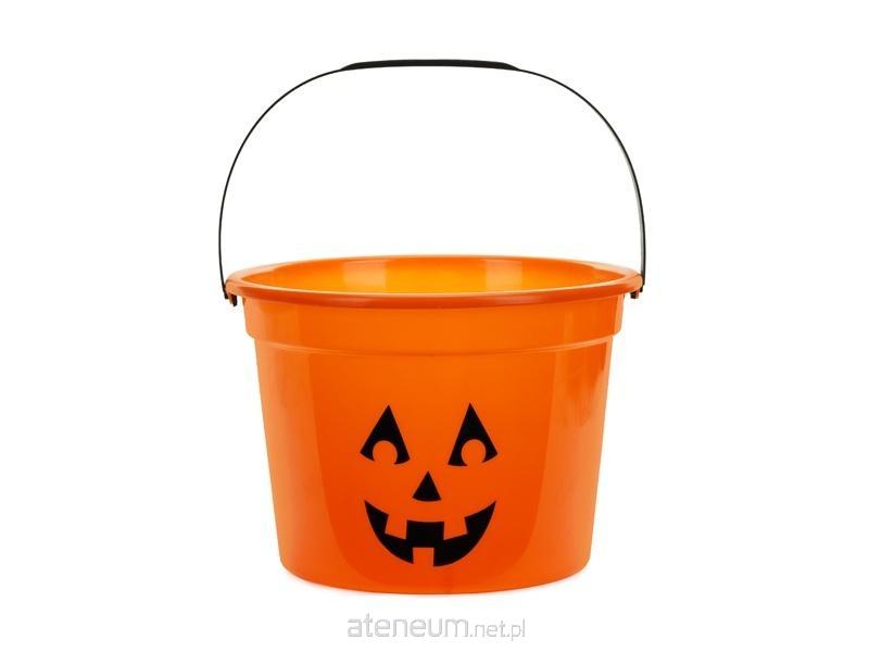 Wiaderko Dynia w kolorze pomarańczowym z czarnym nadrukiem, wymiary ok. 20.5 x 15 cm.
