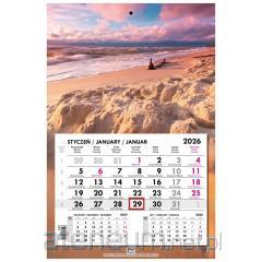 KALENDARZ TRÓJDZIELNY 2026 WYMIAR CAŁKOWITY KALENDARZA: 32 x 85,5cm GŁÓWKA KALENDARZA: Zdjęcie uszlachetniane folią błysk, z efektem wypukłości. KALENDARIUM: wym. 28,5 x 14 cm, trójjęzyczne (PL, GB, D), z numeracją tygodni i imieninami jest przytrzymywane przez kartonowe wypustki, które zapobiegają jego odstawaniu od plecków kalendarza. WYKOŃCZENIE: kartonowa zawieszka, pasek z czerwonym przesuwanym okienkiem, miejsce na notatki. WYMIAR ZDJĘCIA 32 x 22 cm ZDJĘCIE Z EFEKTEM WYPUKŁOŚCI: uszlachetnione folią błysk.
