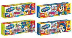 Farby plakatowe 24 kolorów. 12 kolorów podstawowych, 4 kolory brokatowe (zielony, niebieski, fioletowy, czerwony), 4 kolory metalizowane (złoty, srebrny, różowy, niebieski), 4 kolory neonowe (różowy, zielony, żółty, pomarańczowy). Pojemność 20 ml. Farby na bazie wody o intensywnych kolorach. Znakomitą przyczepność pozwala na malowanie takich podłoży jak: papier, karton, drewno, ceramika, kamień. Wymalowane powierzchnie po wyschnięciu są matowe o intensywnych barwach, odporne na działanie światła i ścieranie. Wyprodukowane w Polsce.